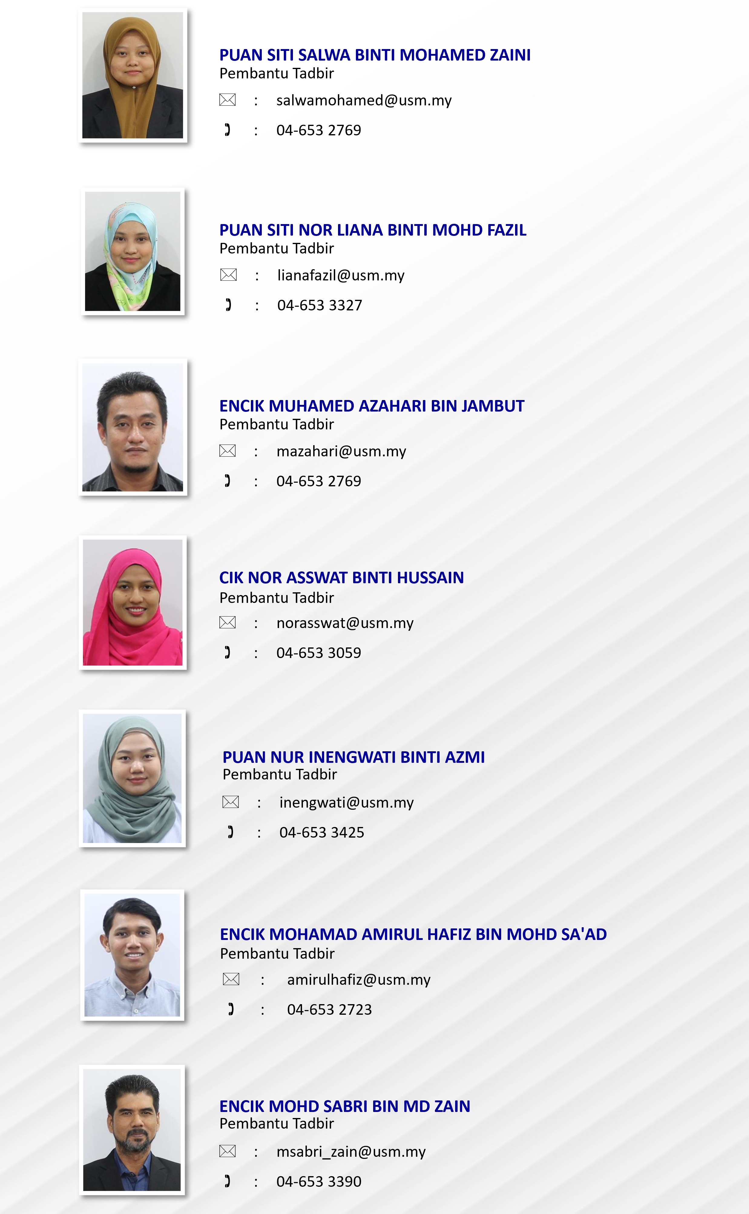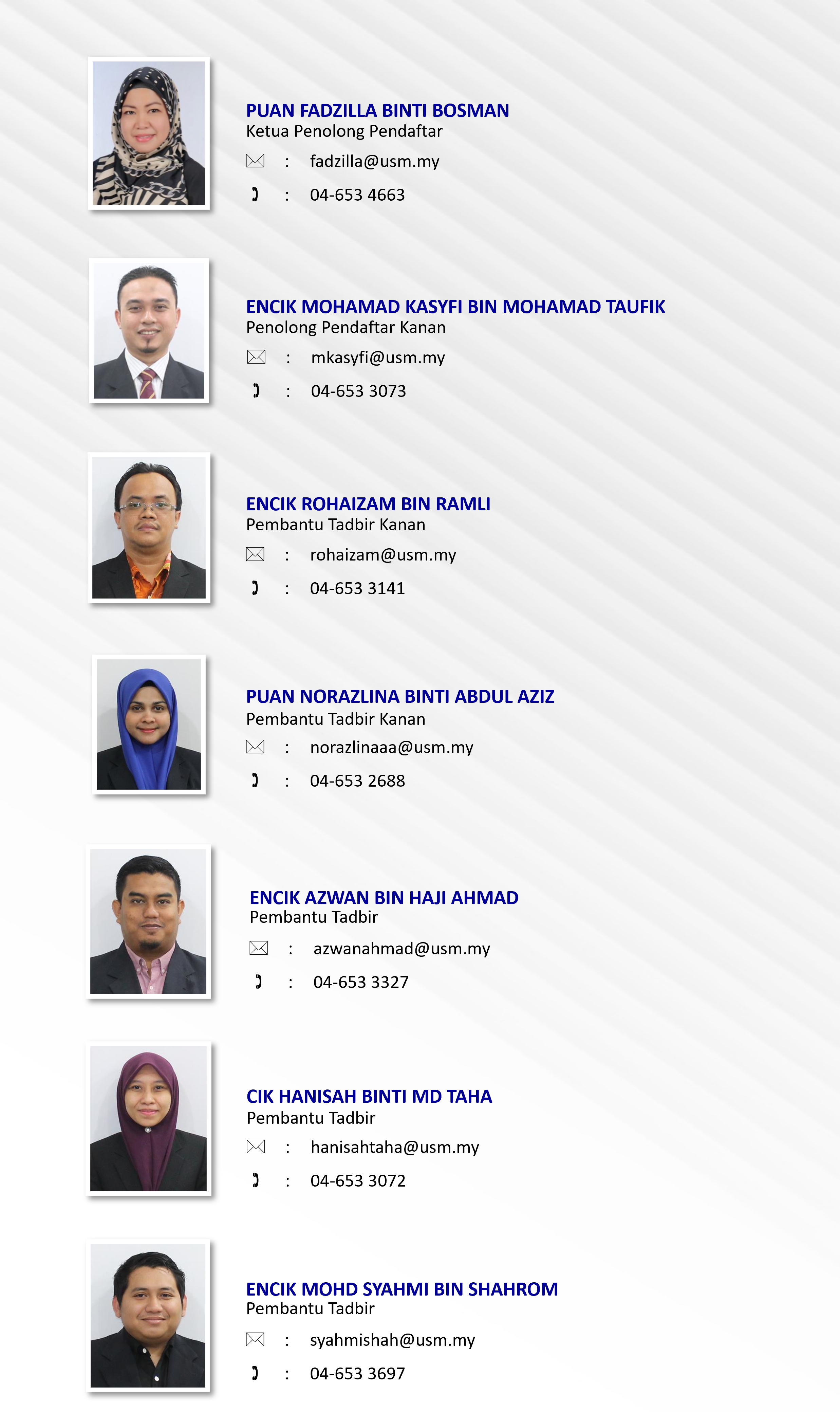 Jabatan Pendaftar, Aras 5 Bangunan Canselori, Universiti Sains Malaysia, 11800 USM, Pulau Pinang
