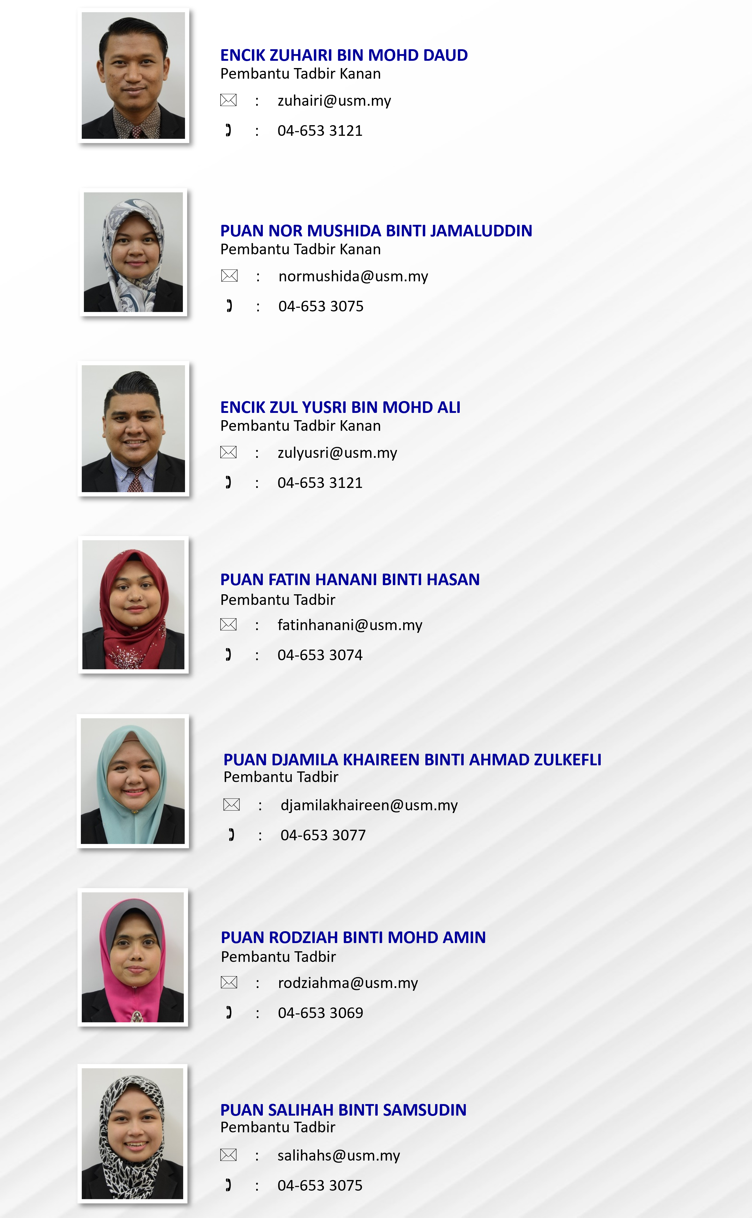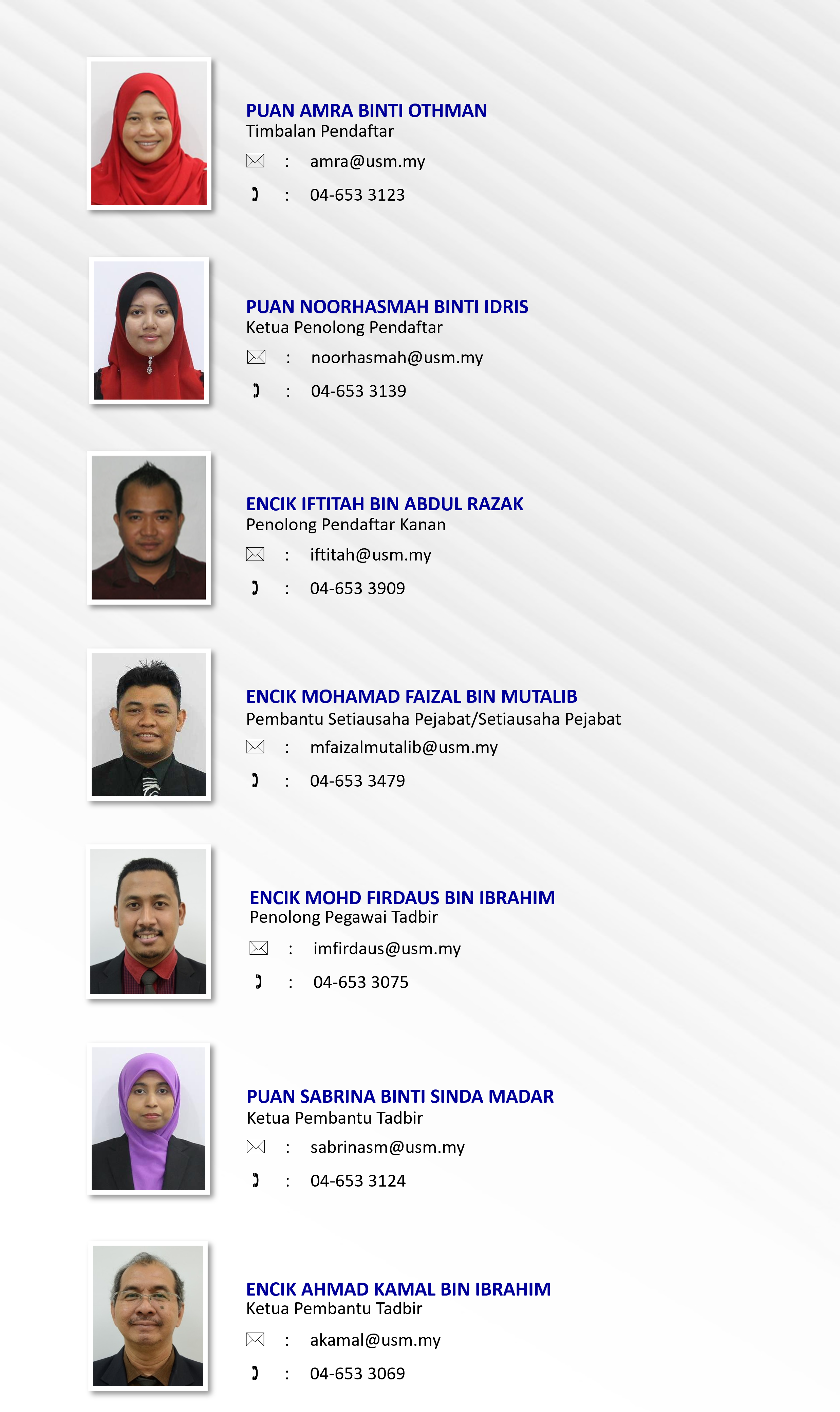 Jabatan Pendaftar, Aras 5 Bangunan Canselori, Universiti Sains Malaysia, 11800 USM, Pulau Pinang